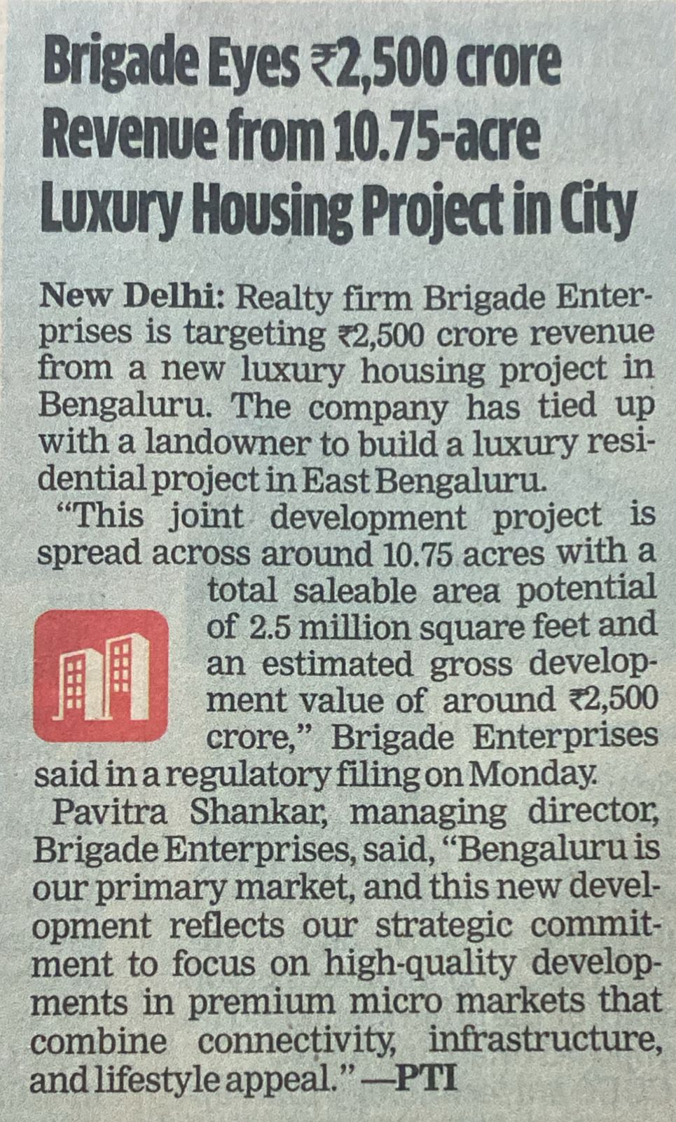Brigade Eyes Rs2,500 crore Revenue from 10.75-acre Luxury Housing Project in City