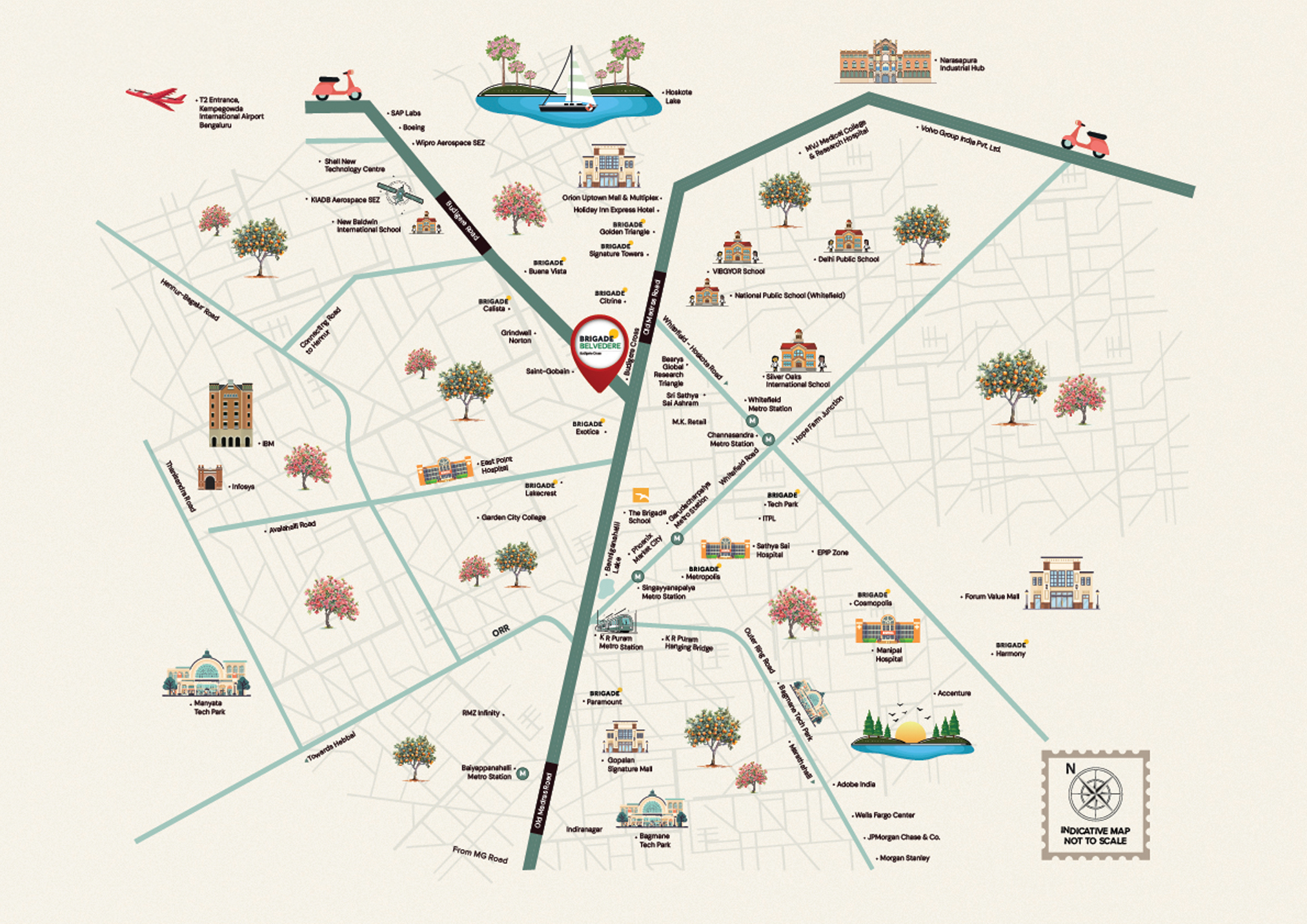 Brigade Belvedere is ideally positioned for Bengaluru's IT workforce. Whitefield - home to some of the city's largest tech parks including ITPL, Prestige Tech Park, and Brigade Tech Park - is approximately 11 km away. KR Puram, a major transit junction connecting to various IT corridors, is just 7 km from these apartments on Budigere Road.