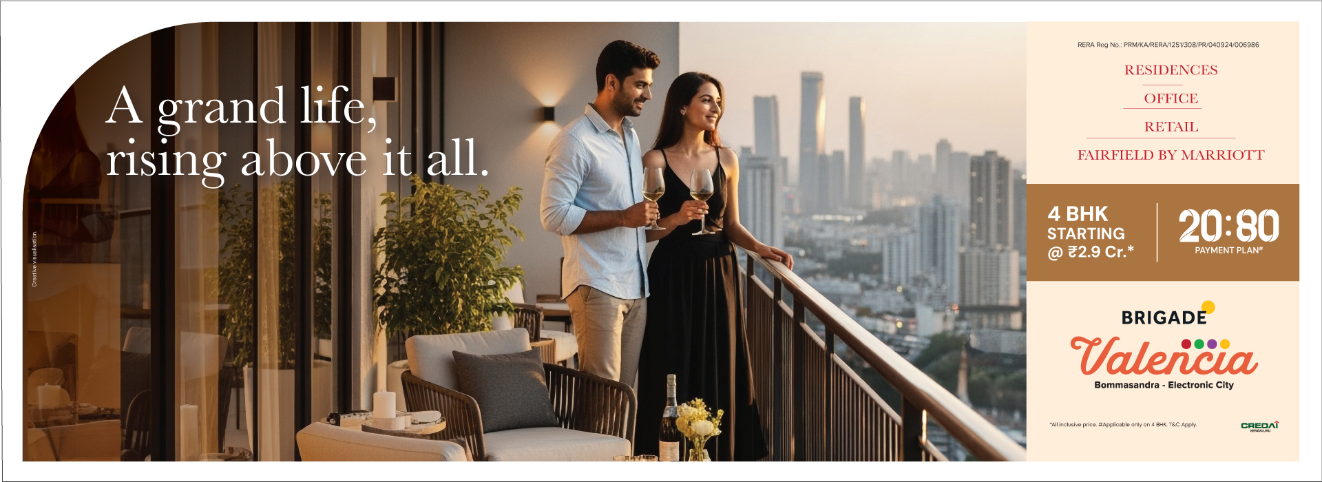 The price of 4 BHK apartments at Brigade Valencia starts from ₹2.55 Crore* onwards.