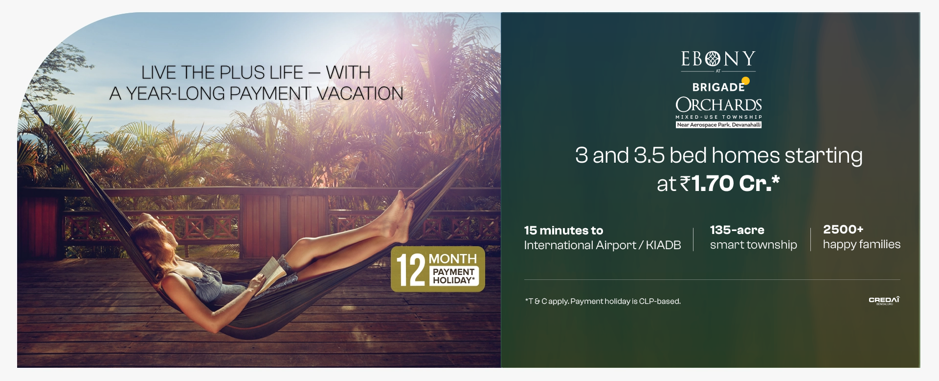 Ebony is part of the Brigade Orchards township in Devanahalli, North Bengaluru, close to Kempegowda International Airport. Its prime location makes it one of the most sought-after choices for homebuyers looking for apartments in Devanahalli.