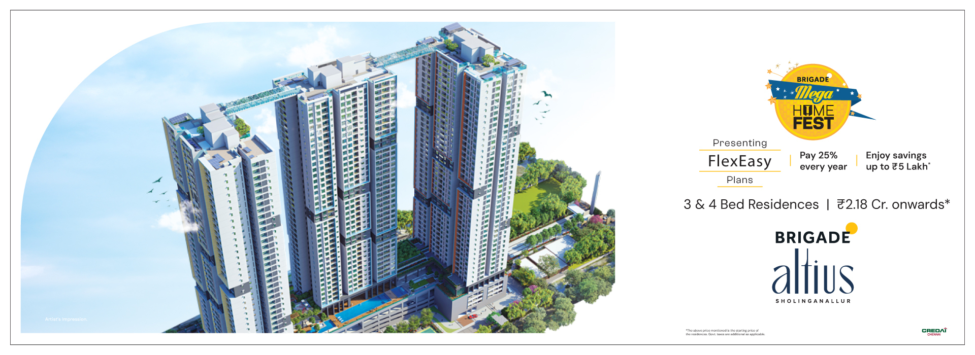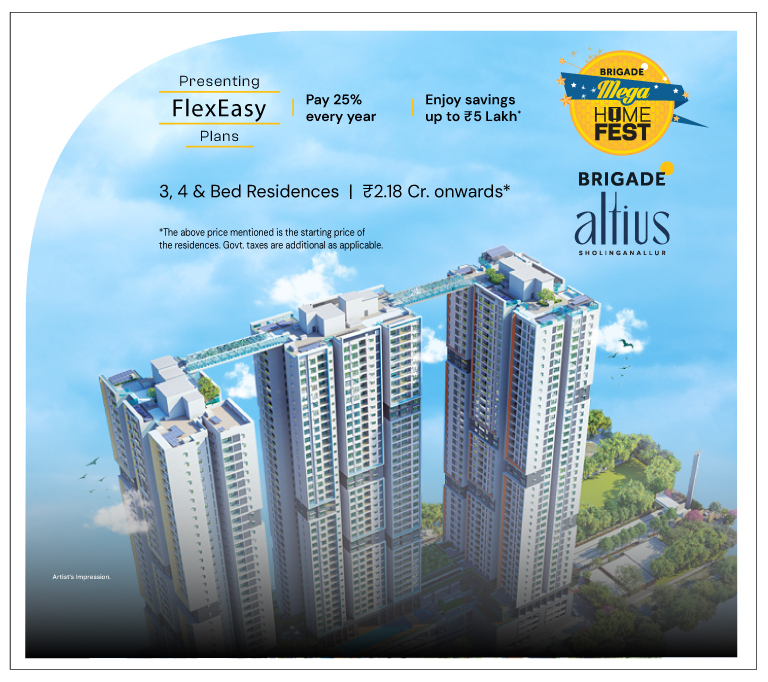 The price of 3 & 4 BHK apartments for sale in Sholinganallur at Brigade Altius starts from ₹2.18 Crore* onwards.