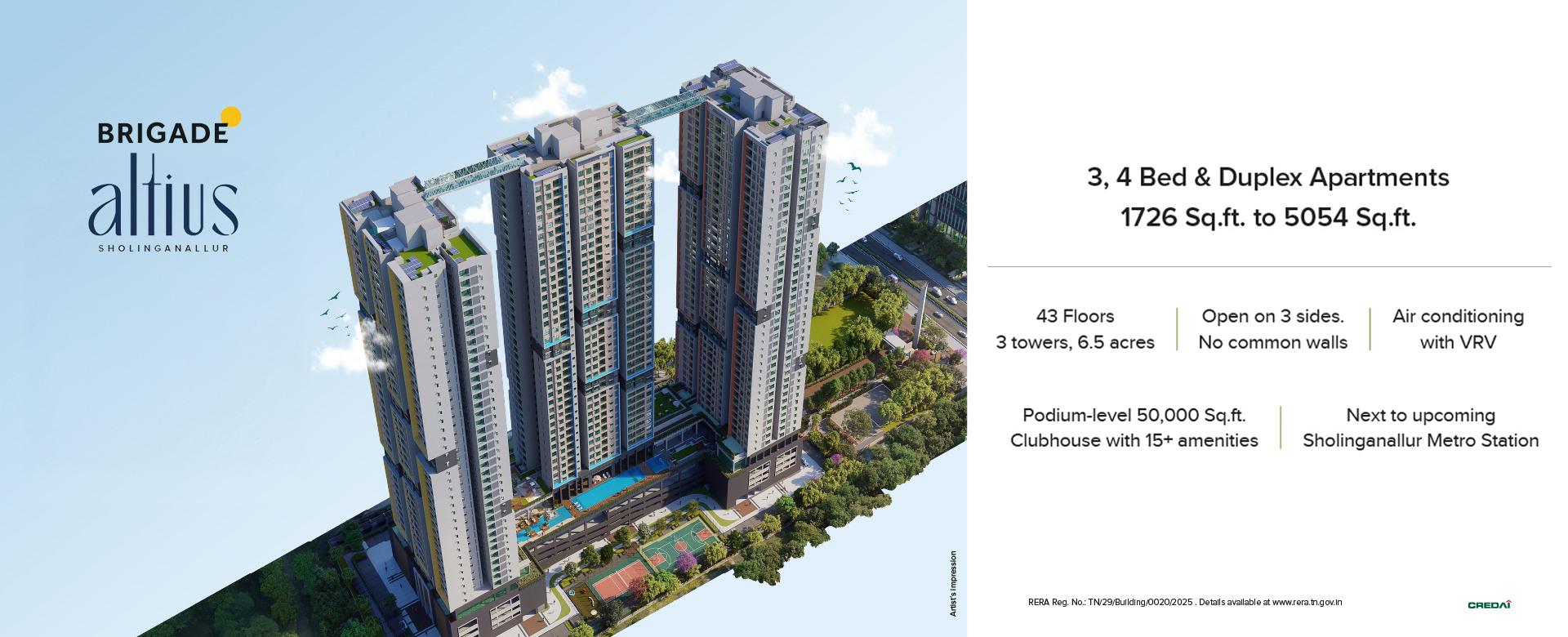 Brigade Altius is an upcoming luxury residential project located in Sholinganallur on OMR Road, Chennai, featuring 3, 4 bed and duplex homes. It spans 6.5 acres and consists of three 43-story towers connected by a skybridge.